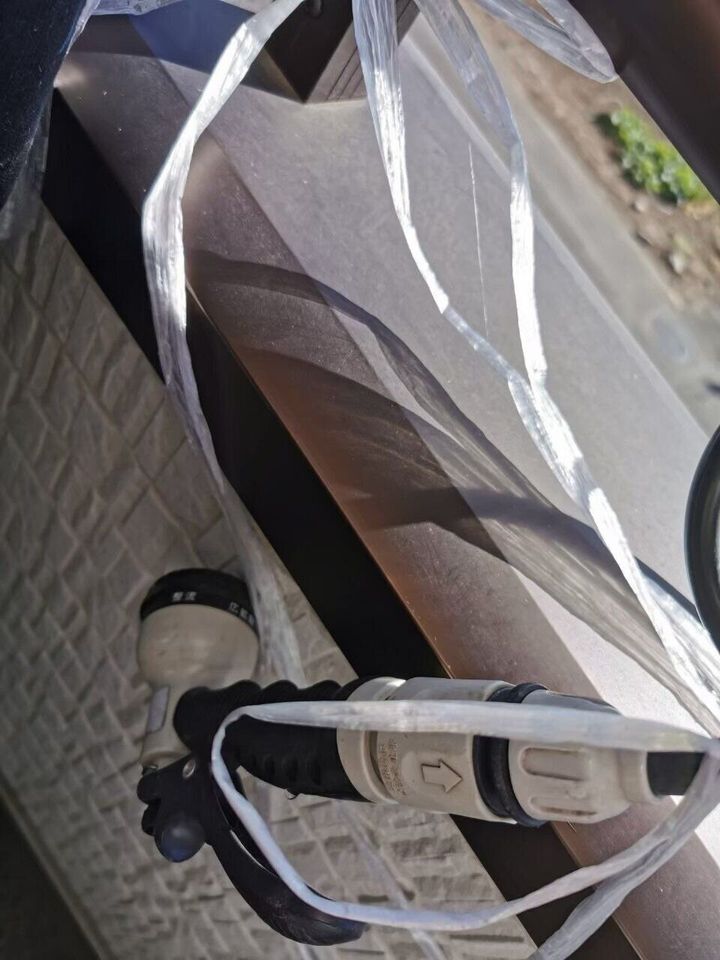 我が家は二階に水道がありません。なので荷造り紐をベランダに結びつけ、一階にたらし外の水道のホースに結び付け、二階に引き上げました!