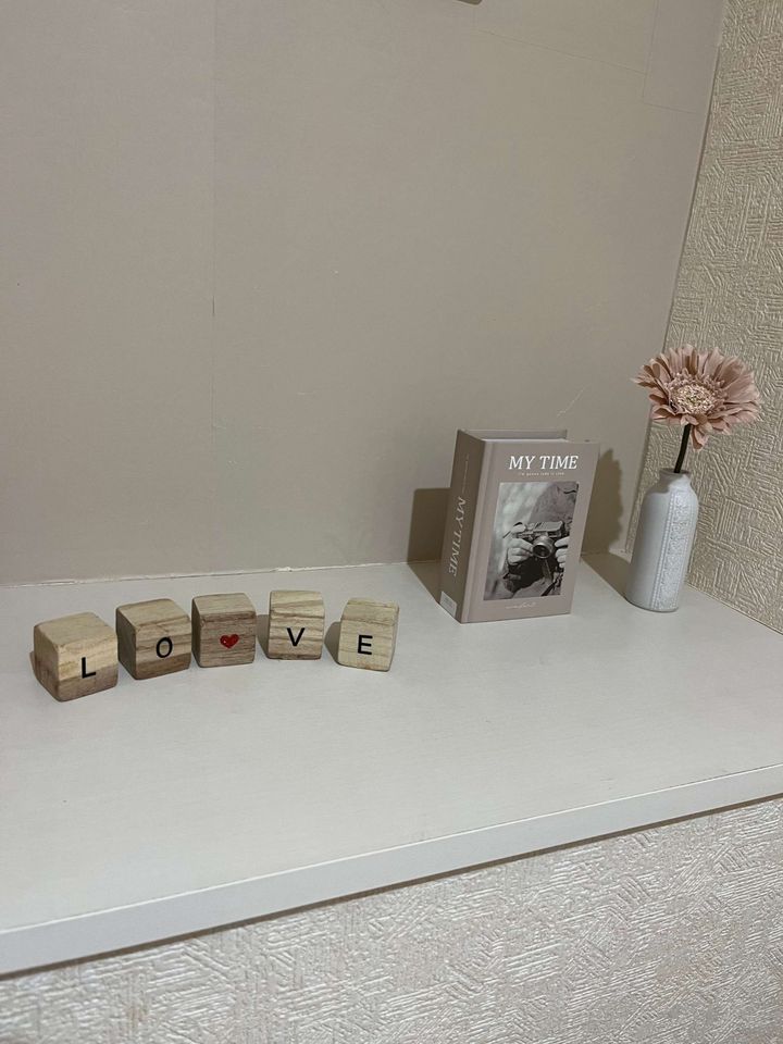 マット、タオル、木のブロック、本の小物入れ、花瓶、造花は全てセリアで購入。