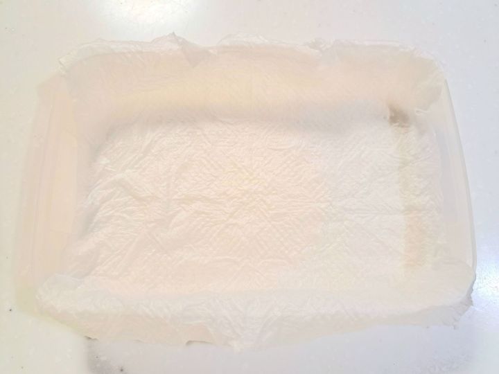 キッチンペーパーを水で軽く濡らしたら、水気が少し残る程度に軽く絞って、1枚のほうをキレイに広げて容器の底に敷きます。