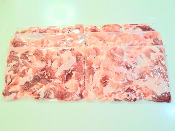 買い出しから帰ったら、ジップロックで小分け冷凍していくのが私のルーティーン。鶏胸肉の場合は、開いて均一な厚さにしてフォークで両面穴を開けてから冷凍するようにしているのですが、豚こま肉ならこのような下処理をする必要がなく、そのままジップロックに入れて冷凍していくだけ。冷凍までの作業時間や洗いものが出ないという点が豚こま肉をストックしているひとつ目の大きな理由です。