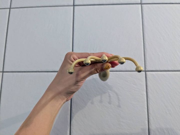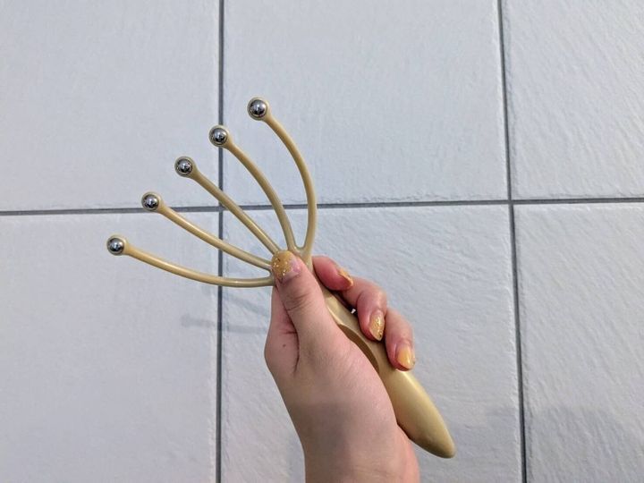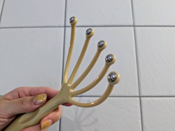 パッと見た感じはまるで熊手のようなブラシですが、ポイントはこの先端の「メタルボール」。程よい刺激で、血行を促進させてくれます。