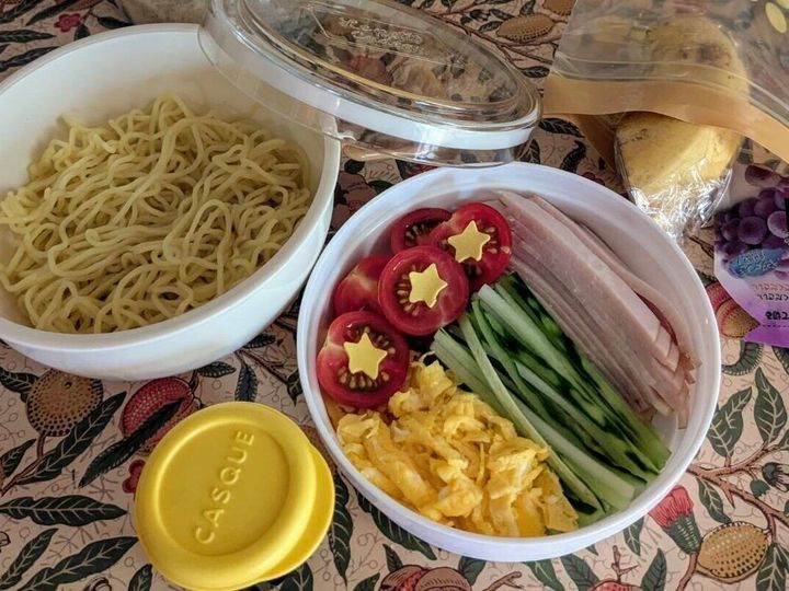 そこで、わが家ではお弁当箱の種類を増やすことで、レパートリーに「麺」や「丼」を追加することに成功!使っているのは、セリアで買える『ラウンドランチボックス』(110円)で、麺やご飯をおかずや具と分けて入れられる2層構造になっています。