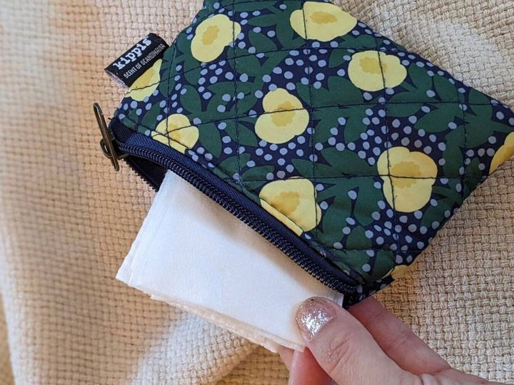 子どもとのお出かけの際、自分のハンカチ1枚でトイレに行くと、一度に何回もハンカチを濡らすことになりますよね。そこで私は、ポケットティッシュケースに「ITO タオル」を数枚入れて出かけるようにしています。