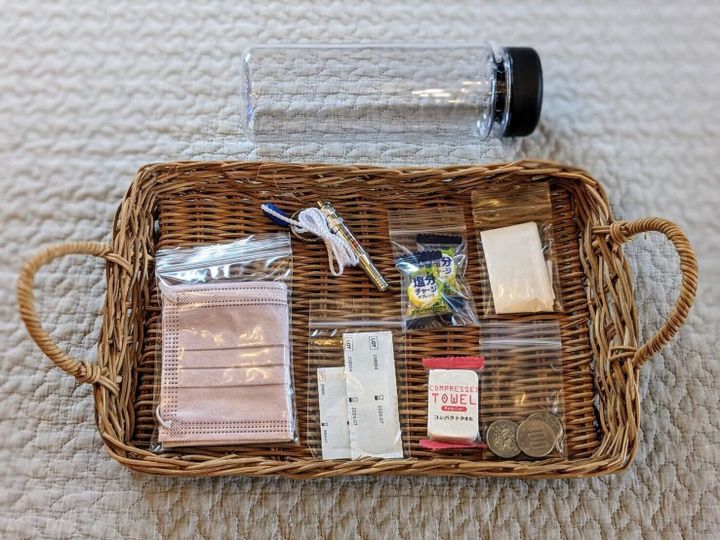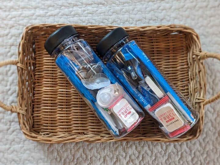 わが家では大人用の防災ボトルに「コンタクトレンズ」や「携帯トイレ」を追加してみました。人によっては、普段飲んでいる薬などを追加しておくと良いですね。