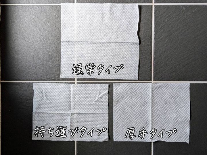 持ち運びタイプの厚さは、通常タイプと同じ。大きさは厚手と同じで一回り小さいものの、外出先でのちょっとした洗顔はもちろん、手拭きとしても優秀なアイテムです。