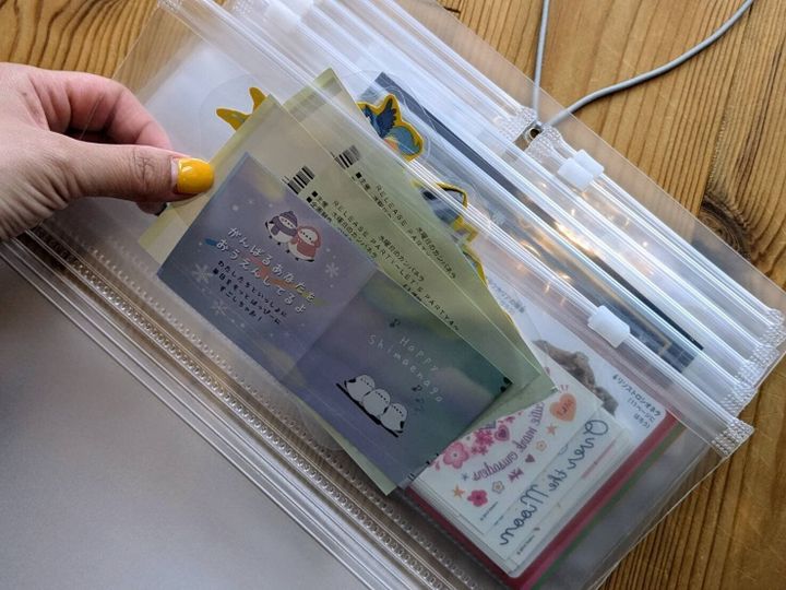 航空券やライブのチケット、お菓子のパッケージなど大きさも厚みも様々ですが、ポケットの大きさに合わせて大切に収納していますよ。