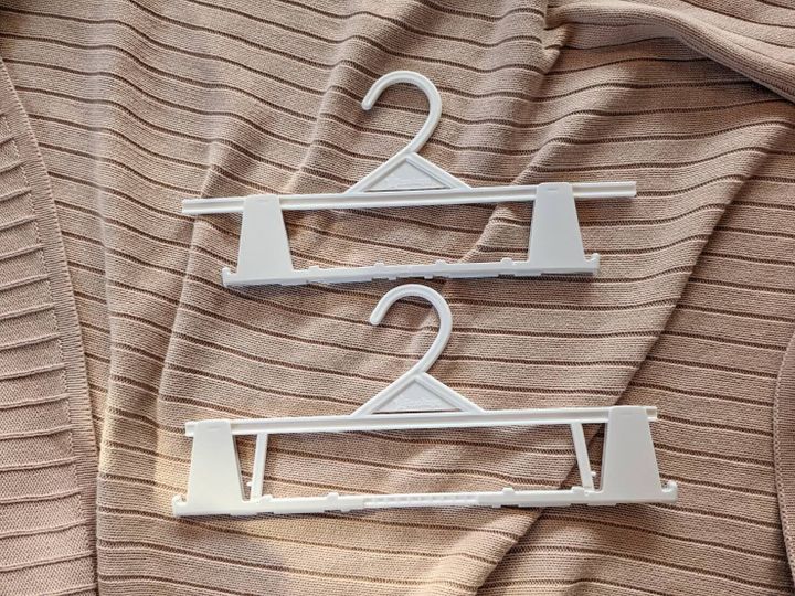 我が家がズボン&スカート収納でずっとお世話になっているハンガーは、西松屋の隠れた名品。伸縮するので、80cmぐらいのベビー服から小学生くらいまで長く使える優れモノ。