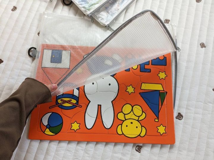 ピースを無くしてしまいがちなパズルの収納にオススメなのも、やっぱりファスナーケース。パズル収納で大事なポイントは「L字」です。