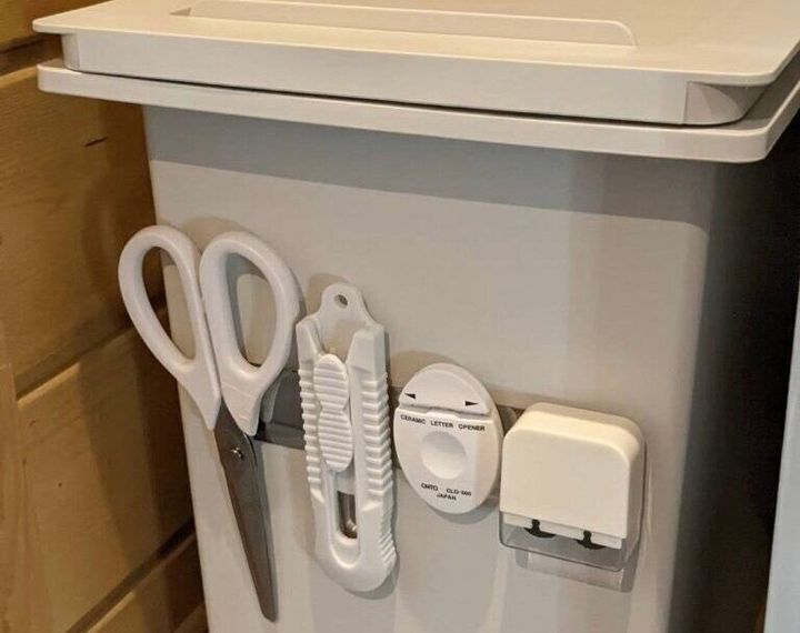 郵便物や宅配便の開封に必要なハサミやカッターなどは、ゴミ箱周辺に集合させるのがポイント。中でもオススメなのが、サッと取り出しサッと戻せるマグネット収納です。