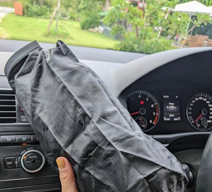 エンジンを切った瞬間から気温上昇が始まる、真夏の車内。特に小さい子どもと一緒だと、ゆっくり丁寧に「傘型サンシェード」を畳んでいる余裕はないので、畳まなくても入る大きめサイズの収納を用意することに!