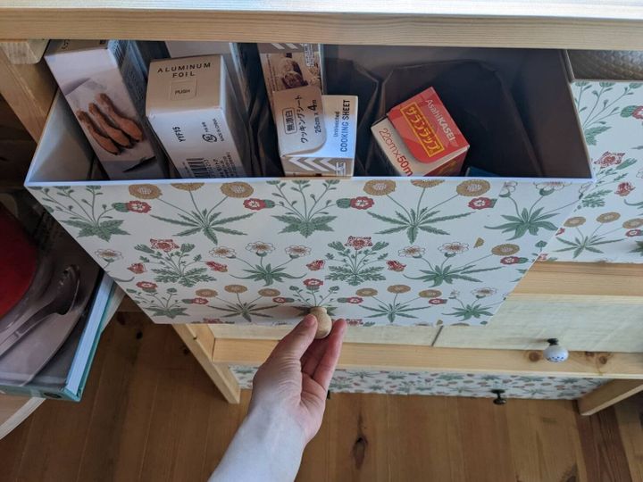 わが家では定番の「ファイルボックス」に、100均のリメイクシートや取っ手を付け、本来の向きとは違う方向で使用しています。リメイクシートはその時のインテリアの好みによってすぐに変更でき、また、使用する向きを変えることで奥行き浅めの収納棚を作ることができました。