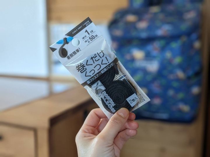 筆者が何度もリピート購入しているのが、100円ショップで買える「面ファスナー結束バンド」! テープ全体がピッタリとくっつく仕様なので、どんな太さの紐も問題なくまとめることができます。