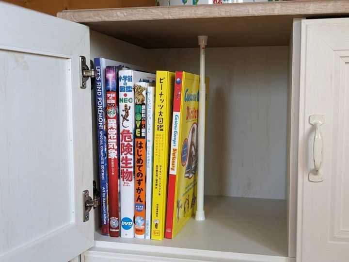 そんな突っ張り棒ですが、実は壁さえあれば「縦」にも突っ張ることが出来るんです。本棚や吊り戸棚などに縦向きに設置すれば、モノをジャンルやグループに分けるための「仕切り」として活躍しますよ。