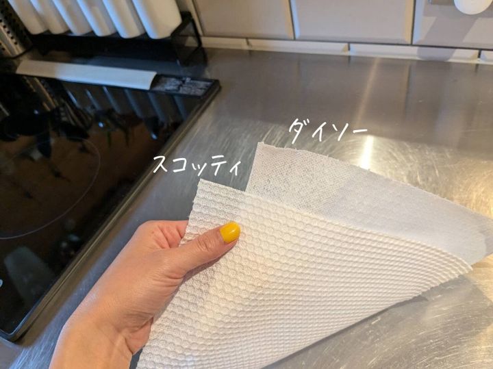 大きさはスコッティが一回り大きく、しっかりとした厚みも感じられます。長年スコッティを使ってた筆者としては、正直ダイソーは心許ない印象を受けました。ただ、スコッティと同じように扱って破けることもなく、野菜の水切りや台ふきんの代用には十分!