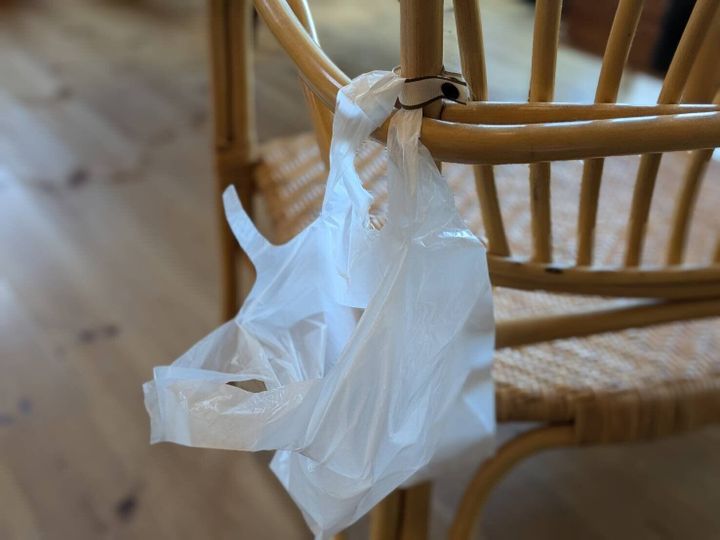 袋の持ち手と椅子にネームタグを通してしっかりと固定しておけば、もう風も怖くはありませんよ。