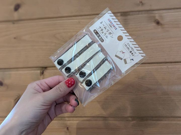本来は、直接名前の書き込みができないモノや、お下がり目的などで記名を避けたいアイテムに記名するための「ネームタグ」。「ネームタグ」の他、「お名前タグ」、「ネームリボン」など商品名は様々ですが、どこの100円ショップの手芸コーナーにもある定番アイテムです。