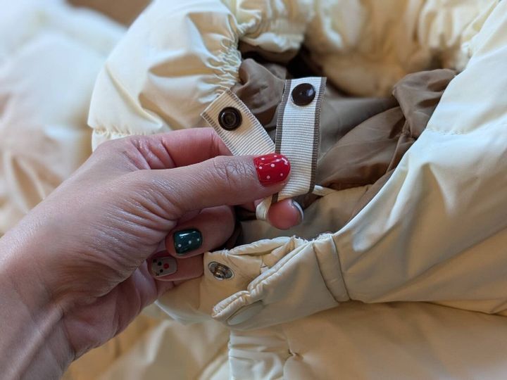 「ネームタグ」は最初から「スナップボタン」の付いたデザインなので、長さを調整したりと面倒な作業が発生しないのもうれしいですね。もちろん、本来の用途通りにここに記名もしておけば、アウターを無くさずに済みます。付け外しがラクなので、使い回しできるのも助かりますね。