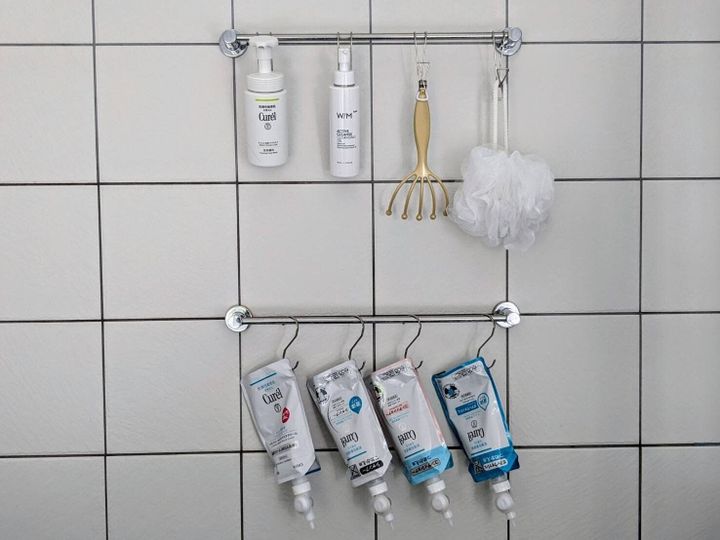 最近多い、すべてのお風呂グッズをかごに入れて入浴時のみ浴室に持って行く「銭湯方式」は、そこそこ面倒くさがりの筆者には向かない収納法。お風呂上がりにしっかりと水滴を拭き取り、脱衣所に戻すのはハードルが高いため、やはり「吊るす収納」がベストでしたよ。