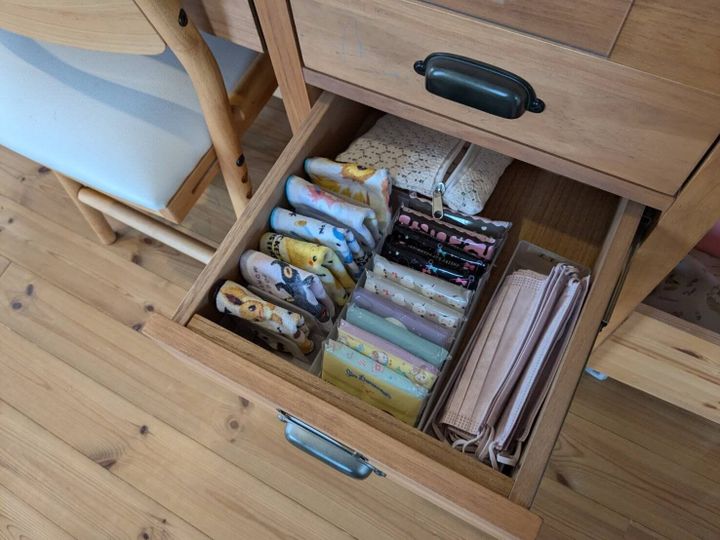 しっかりと仕切ることで、たたまずポイっと入れているだけの大雑把な収納でも服や小物同士が絡まることなく、取り出しもスムーズです。