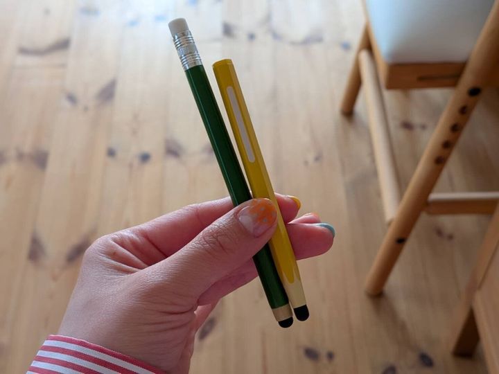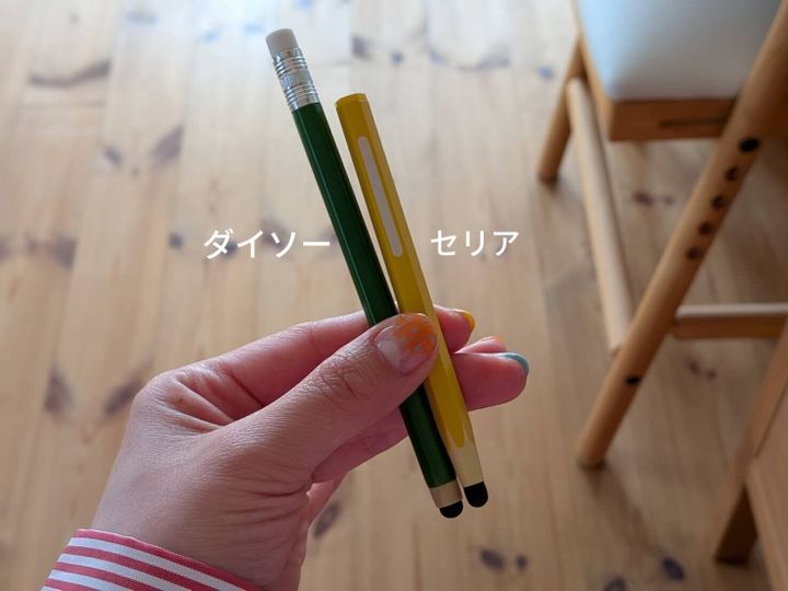 そこでオススメなのが100均のタッチペン。セリアは短めの作りなので、まだ手の小さな低学年にピッタリ!ダイソーには、消しゴムモチーフまでついた、よりリアルな「えんぴつ型タッチペン」が販売されています。
