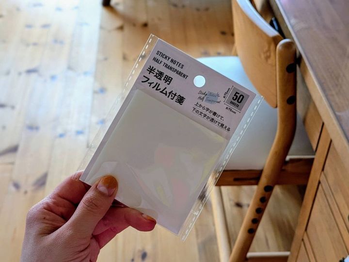 続いて紹介するのは、下の文字が透けて見える『半透明フィルム付箋』。同様の商品自体は筆者が子どもの頃からありますが、地図に貼ってメモを残すなどの用途が一般的でした。