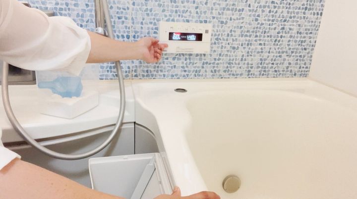 浴室へゴミ箱を移動します。給湯温度を60度に設定。オキシクリーンは40~60度のお湯に溶かすことで酸素が発生し、この泡が汚れをはがして落としてくれます。