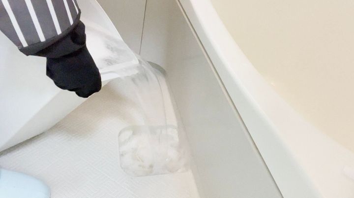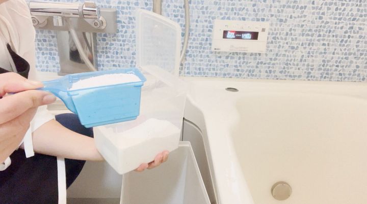 シャワーの勢いを使って、オキシクリーンをよく混ぜて溶かします。そうするとモコモコと泡立ってきますよ。