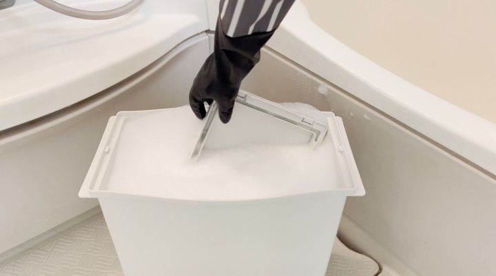 ふちいっぱいお湯がたまったら、シャワーを止めます。フタがあれば一緒につけ置きしましょう。