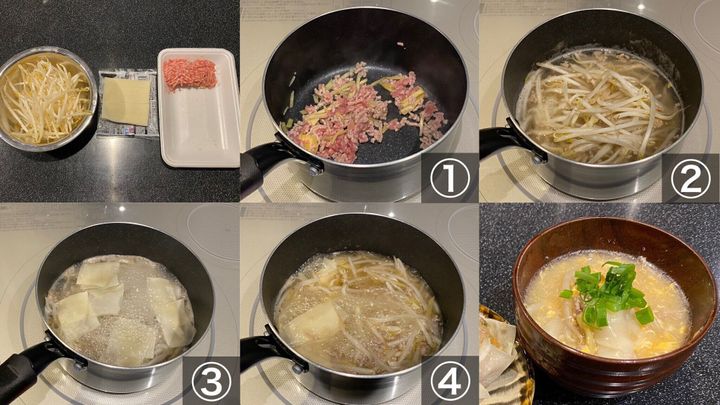 2、お肉の色が大体変わったら水を入れて、沸騰したらもやしを入れて2、3分煮る。