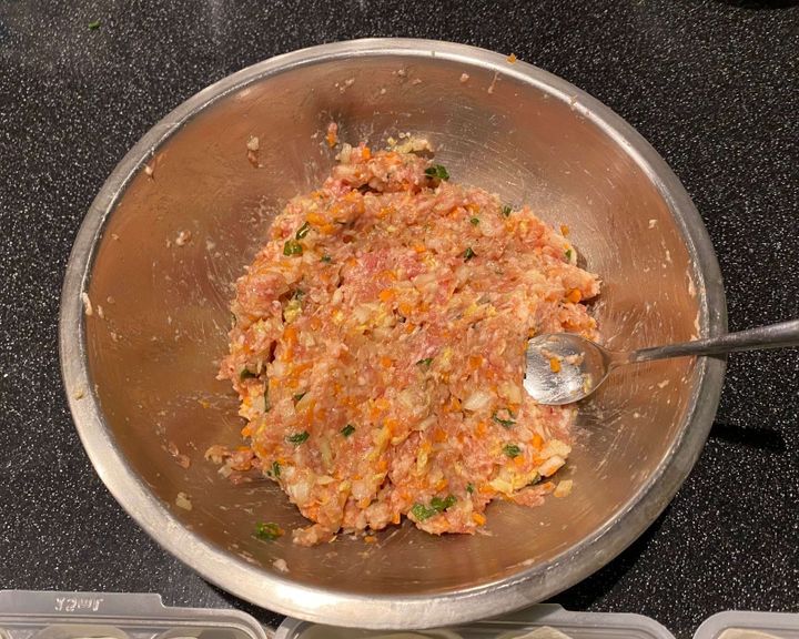 入れる野菜はすべてみじん切りにします。白菜は軽く“塩もみ”してからみじん切りにするとお肉と馴染みます。(人参、玉ねぎはどこのご家庭にもあるかと思います。冬なので白菜も旬の野菜です。
