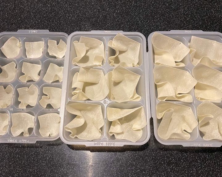 大きいのにはワンタンの皮を1枚ずつ敷きます。小さいのにはワンタンの皮1枚を4等分して敷きます。