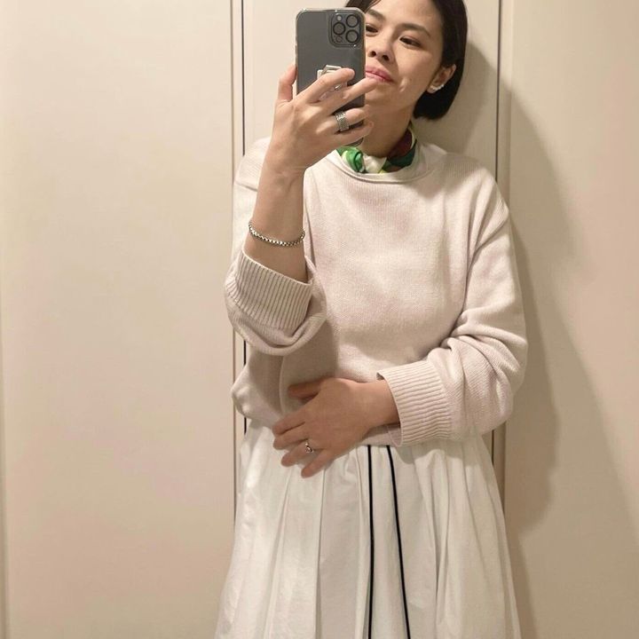 ドレスコードは〈グリーン〉ということで、私らしく楽しめるのは何かな?と考えて、やっぱりスカーフにしよう!と、UNIQLO×MARNIのコラボアイテムを首元に覗かせて行きました。