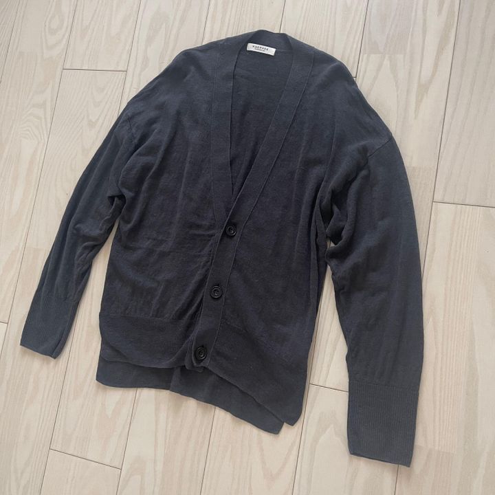 そこで出会ったのが、こちらのゆったりシルエットの麻のVネックカーディガン。せっかくの買い替えは、1枚でも着られるものがいい、とサイズ感を見直して購入。