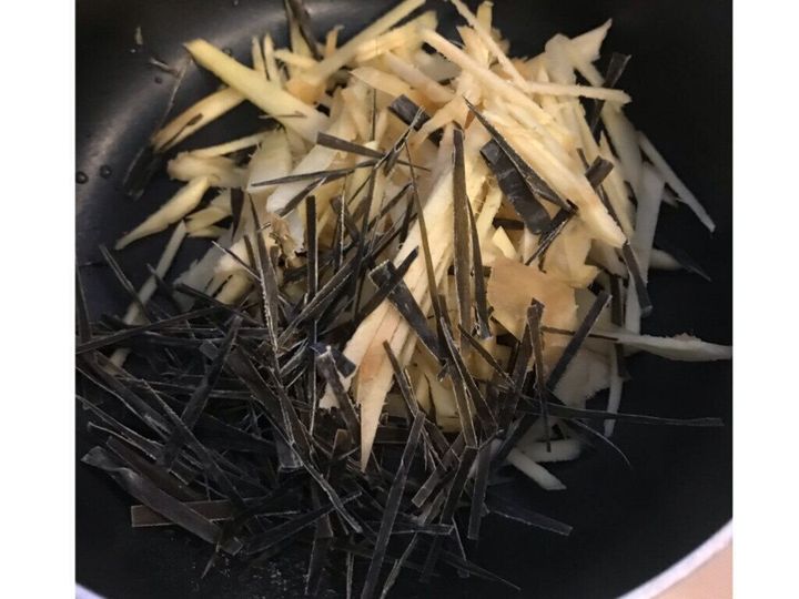 (1)生姜と出汁昆布を千切りにして一緒に鍋に入れる