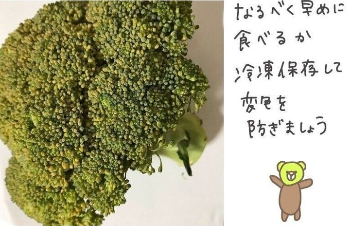 ブロッコリーを冷蔵庫で10日以上保存すると色が変色して黄色っぽくなってしまいます。ブロッコリーは本来花蕾と呼ばれる花の蕾部分を食べているのですが、黄色っぽくなっているのは花が咲く前の状態になっている証拠です。変色する前にきちんと保存して食べるのがおすすめです。