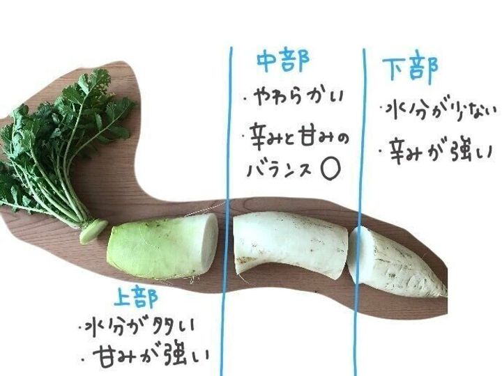 大根は部位によって味が異なります。下部より上部の方が甘みが強いため、生色する場合は上部を選びましょう。また、中部は味が染み込みやすいため煮物など、下部は水分量が少ないため漬物などに使用するといいでしょう。