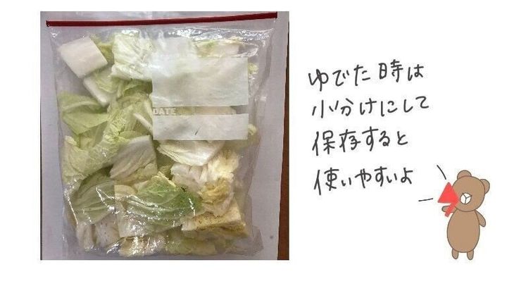 ざくぎりして保存袋に入れて保存する。茹でてから保存することも可能です。約1ヶ月保存可能