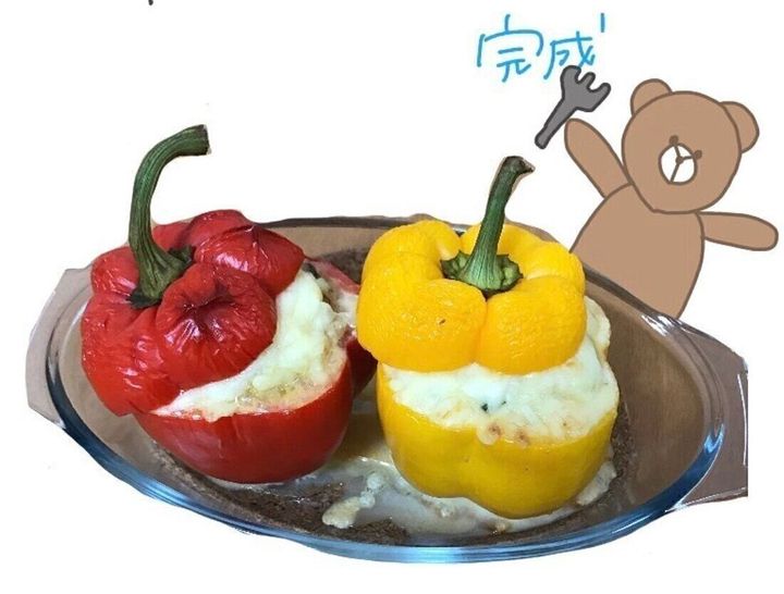 ③パプリカの中に①のミンチを詰めて上からチーズをふりかける