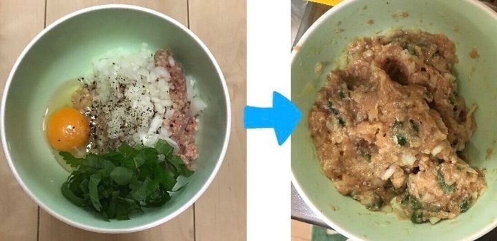 ①ボウルにひき肉・卵・みじん切りにした玉ねぎと大葉・塩コショウをくわえて混ぜる