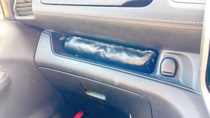 私の車ではシフトレバーに持ち手を置くと丁度良い。開くだけなので助手席側に手が届かないことも心配いらないのです。