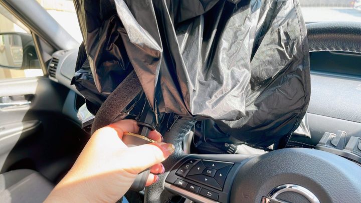 従来だと、熱々のサンシェードをサッと取って熱い熱い!と言いながら折り畳んでいましたが、このサンシェードは折り畳み傘のように閉じて、クルクルッとマジックベルトを止めるだけ。マジックベルトが約二周分と長めな仕様で止める範囲も広めなのが良いところ。適当にクルクルッとしても簡単にまとめられます。