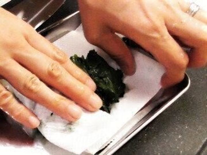 切ったほうれん草は再度水気を絞り、更にキッチンペーパーでしっかりと水気を拭き取る。