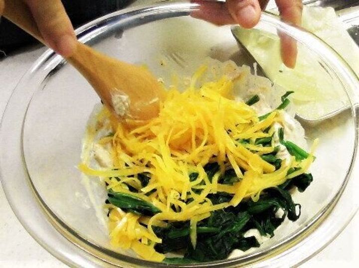 [4].ボウルに適度に汁気をきったツナを加える。★の調味料を加えてよく混ぜ、[2]のほうれん草と[3]の水気を拭き取ったにんじんを加えて全体的に混ぜたら完成。