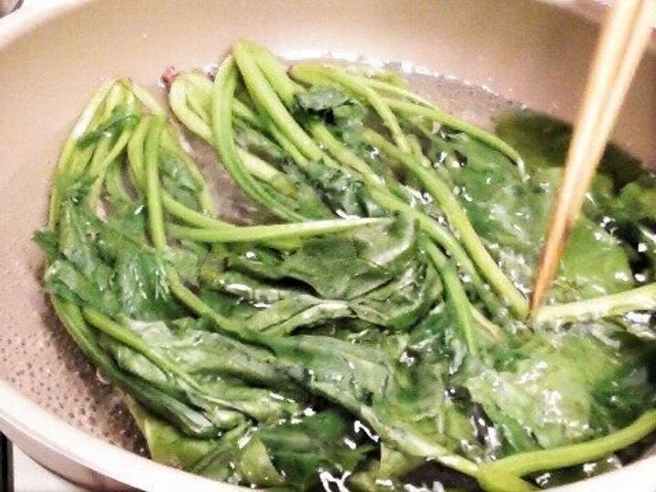 [1].ほうれん草を洗い、塩を加えた沸騰したお湯で茹でる。茹で上がったら冷水に取って冷ます。
