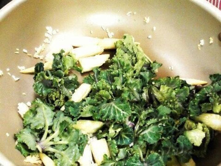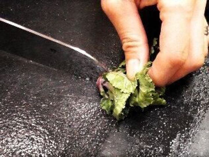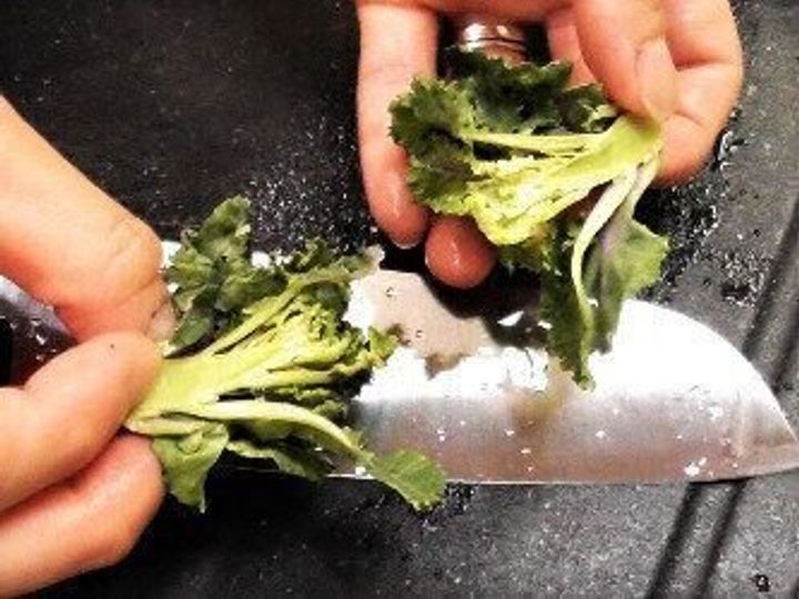 [1].プチヴェールの株が大きいものは、根元の部分に切り目を入れて手で割き2~3等分にし、水気をよく拭き取っておく。