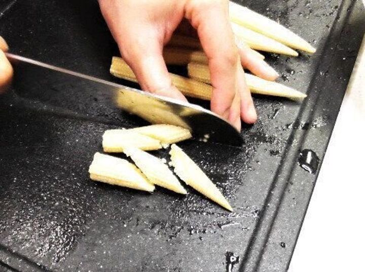 [2].ヤングコーンは2~4等分の斜め切りにし、プチヴェール同様、水気を拭き取っておく。