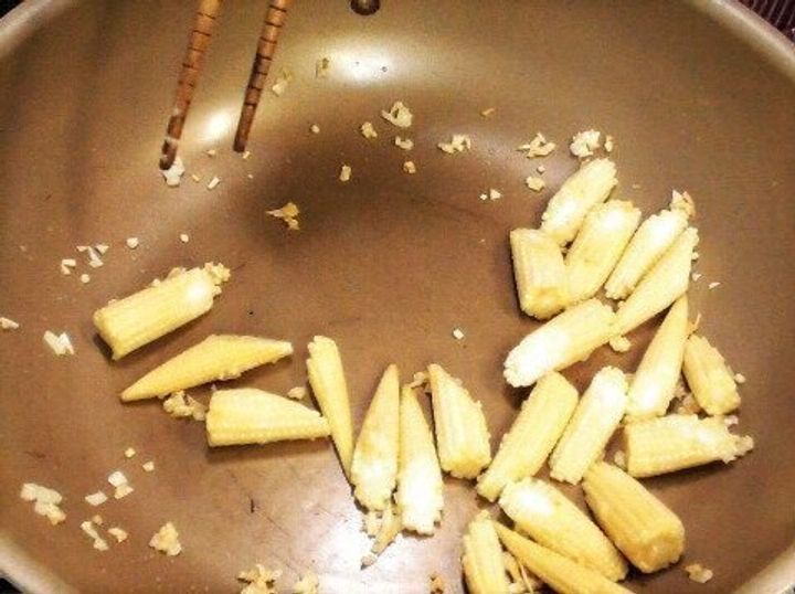 [6].[5]のヤングコーンの黄色が濃くなってきたら[1]を加えて軽く炒める。