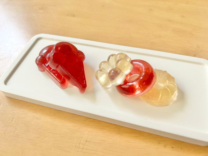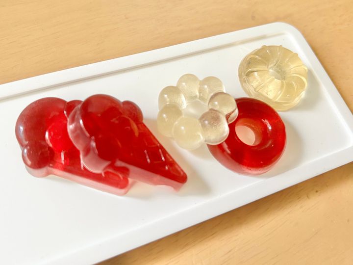冷蔵庫に入れてから30分もすれば固まりますが、一晩置くと食感がしっかりしてよりグミらしくなりますよ。