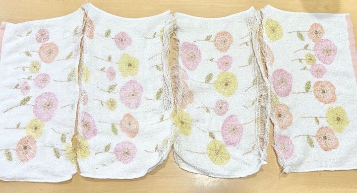 タオルはハサミで端に切れ込みを入れたらあとは思い切りビュッと割くだけ。これがストレス発散で気持ちがいいですよ。