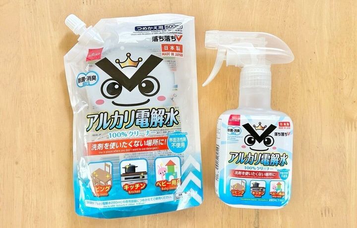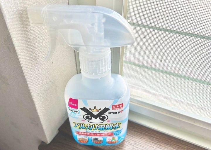 継続のきっかけを作ってくれたのがダイソーで見つけた「アルカリ電解水」。クリーナーをこれ1本に絞ってから、毎日拭き掃除するハードルが低くなったのです。